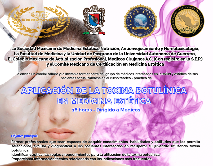 La Sociedad Mexicana de Medicina Estética, Nutrición, Antienvejecimiento y Homotoxicología, La Facultad de Medicina y la Unidad de Posgrado de la Universidad Autónoma de Guerrero, El Colegio Mexicano de Actualización Profesional, Médicos Cirujanos A.C. (Colegio registrado en Dirección General de Profesiones de la Secretaría de Educación Pública; Registro Federal: F452) y el Comité Mexicano de Certificación en Medicina Estética, Le envían un cordial saludo y lo invitan a formar parte del grupo de médicos interesados en la salud y estética de sus pacientes actualizándose en el curso: