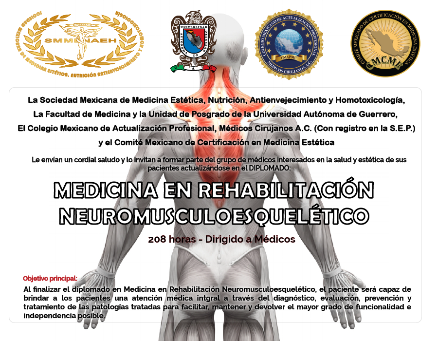La Sociedad Mexicana de Medicina Estética, Nutrición, Antienvejecimiento y Homotoxicología, La Facultad de Medicina y la Unidad de Posgrado de la Universidad Autónoma de Guerrero, El Colegio Mexicano de Actualización Profesional, Médicos Cirujanos A.C. (Colegio registrado en Dirección General de Profesiones de la Secretaría de Educación Pública; Registro Federal: F452) y el Comité Mexicano de Certificación en Medicina Estética, Le envían un cordial saludo y lo invitan a formar parte del grupo de médicos interesados en la salud y estética de sus pacientes actualizándose en el diplomado: