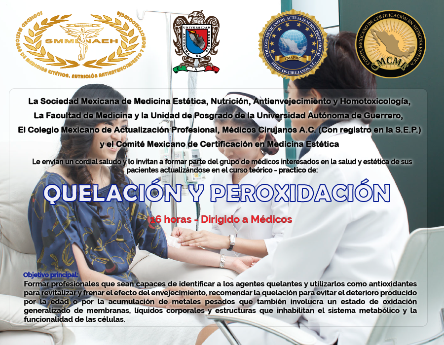 La Sociedad Mexicana de Medicina Estética, Nutrición, Antienvejecimiento y Homotoxicología, La Facultad de Medicina y la Unidad de Posgrado de la Universidad Autónoma de Guerrero, El Colegio Mexicano de Actualización Profesional, Médicos Cirujanos A.C. (Colegio registrado en Dirección General de Profesiones de la Secretaría de Educación Pública; Registro Federal: F452) y el Comité Mexicano de Certificación en Medicina Estética, Le envían un cordial saludo y lo invitan a formar parte del grupo de médicos interesados en la salud y estética de sus pacientes actualizándose en el curso: