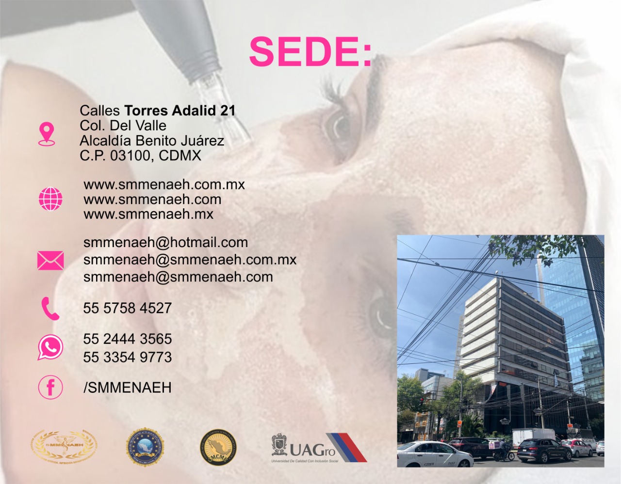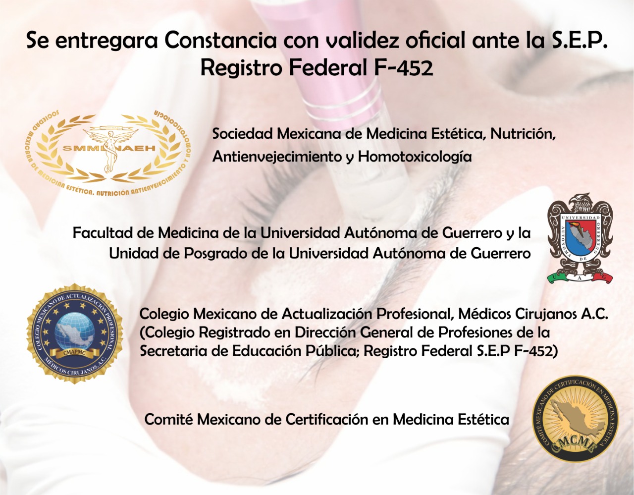 La Sociedad Mexicana de Medicina Estética, Nutrición, Antienvejecimiento y Homotoxicología, La Facultad de Medicina y la Unidad de Posgrado de la Universidad Autónoma de Guerrero, El Colegio Mexicano de Actualización Profesional, Médicos Cirujanos A.C. (Colegio registrado en Dirección General de Profesiones de la Secretaría de Educación Pública; Registro Federal: F452) y el Comité Mexicano de Certificación en Medicina Estética, Le envían un cordial saludo y lo invitan a formar parte del grupo de médicos interesados en la salud y estética de sus pacientes actualizándose en el curso:
