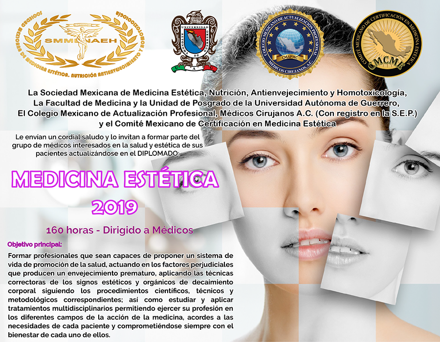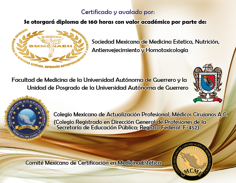 La Sociedad Mexicana de Medicina Estética, Nutrición, Antienvejecimiento y Homotoxicología, La Facultad de Medicina y la Unidad de Posgrado de la Universidad Autónoma de Guerrero, El Colegio Mexicano de Actualización Profesional, Médicos Cirujanos A.C. (Colegio registrado en Dirección General de Profesiones de la Secretaría de Educación Pública; Registro Federal: F452) y el Comité Mexicano de Certificación en Medicina Estética, Le envían un cordial saludo y lo invitan a formar parte del grupo de médicos interesados en la salud y estética de sus pacientes actualizándose en el diplomado: