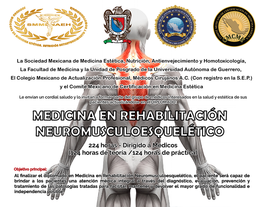 La Sociedad Mexicana de Medicina Estética, Nutrición, Antienvejecimiento y Homotoxicología, La Facultad de Medicina y la Unidad de Posgrado de la Universidad Autónoma de Guerrero, El Colegio Mexicano de Actualización Profesional, Médicos Cirujanos A.C. (Colegio registrado en Dirección General de Profesiones de la Secretaría de Educación Pública; Registro Federal: F452) y el Comité Mexicano de Certificación en Medicina Estética, Le envían un cordial saludo y lo invitan a formar parte del grupo de médicos interesados en la salud y estética de sus pacientes actualizándose en el diplomado: